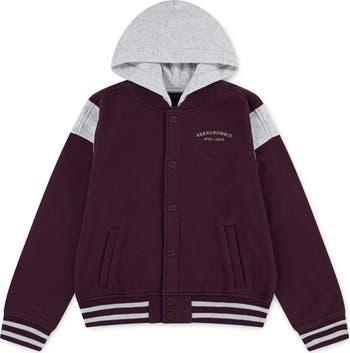 Send your child off in cozy comfort and varsity style, wearing a cotton-blend fleece bomber jacket edged in striped contrast and topped with a roomy hood.