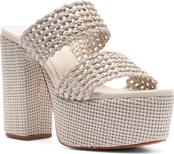 A towering platform and block heel add dramatic height and retro flair to a Brazilian-made slide sandal shaped from finely braided leather.