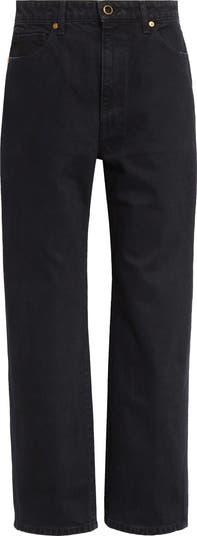 Cropped hems counterbalance the high waist of these hand-finished straight-leg jeans cut from nonstretch denim. Each pair features an enameled antique-brass button for a distinctive touch.