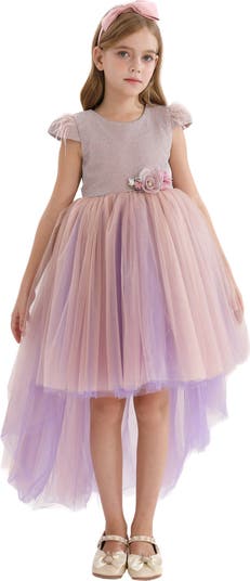 The Abinante dress is a stunning and elegant choice for any special occasion. This dress features a teacup shoulder bodice that shimmers in a beautiful light purple, adding a touch of magic and sophistication. The floral embellishment at the hip provides a delicate and charming detail, enhancing the overall look.