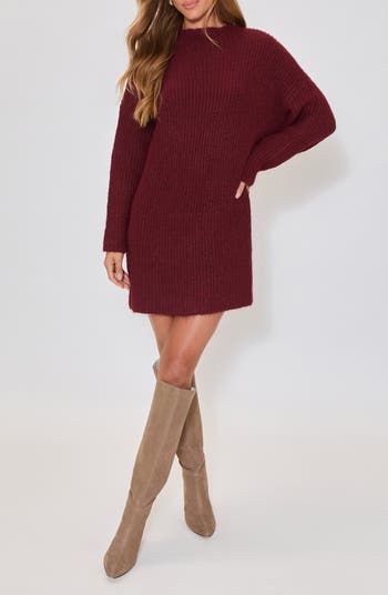 Keep cozy and chic during the chilly months in an abbreviated sweater-dress textured in soft ribbing and eased with dropped shoulders.