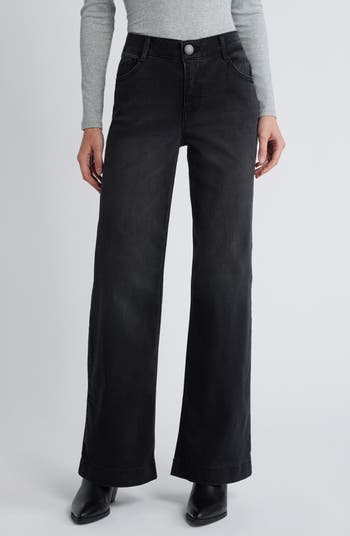 These stretchy, casual-cool jeans create a sleek silhouette with a high waist, full-length wide legs and 'Ab'Solution powermesh shaping panels that mold and hold.
