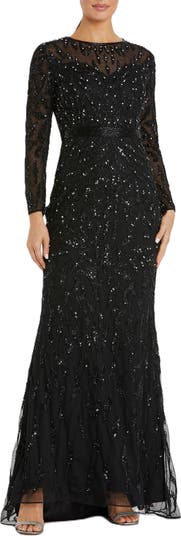 This long sleeve evening gown showcases a beaded neckline, illusion yoke and sleeves, fitted bodice, and a floor-length mermaid skirt, featuring sequin accents and a beaded belt.