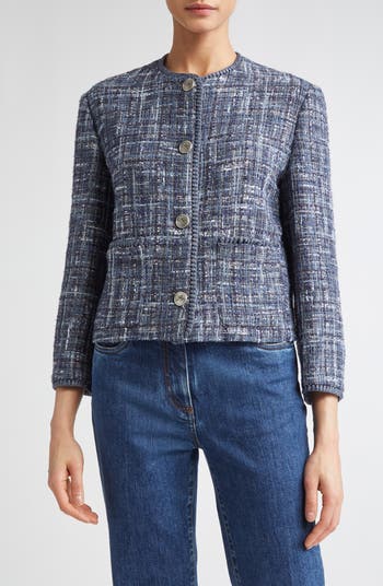 Signature paisley takes a supporting role as the colorful lining on this boxy, foreshortened jacket in an abstractly checked nubby bouclé.