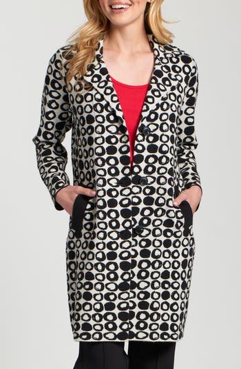 An allover geo print brings mesmerizing polish to this soft sweater-coat made with hand-warming pockets.