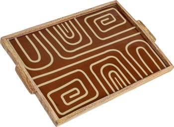 This Abstract Elegance Mango Wood Tray is a versatile addition to any home. The enameled surface, adorned with abstract lines, creates a visual feast that complements the tray's practicality. Its food-safe quality makes it perfect for presenting everything from appetizers to desserts. The brown, cream, and natural color palette exudes a warm, inviting vibe, while the built-in handles ensure comfortable transport. With dimensions of 15.00 inches in length, and 9.75 inches in width, it's sized just right for intimate gatherings or everyday use, making it as functional as it is beautiful.