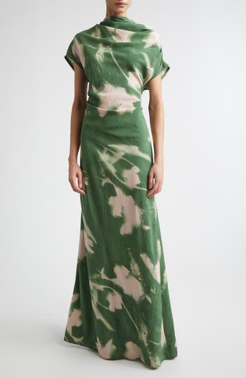 Lela Rose captures the unbridled beauty of wildflower fields in painterly abstract flora on this fluid, lightweight crepe gown with an artfully draped bodice that flows into a floor-grazing A-line skirt.