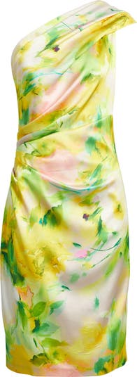 Impressionistic blooms gentle a ruched satin sheath cut to show off one shoulder and sure to be the topic of cocktail chatter.