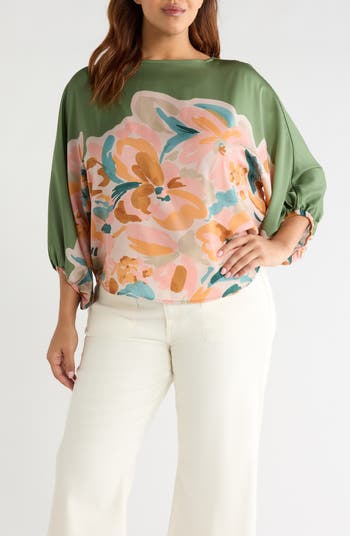 A clean boat necklace balances the drapey silhouette of this abstract floral top where peasant sleeves release soft volume through the arms.