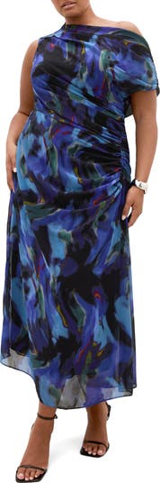 A painterly floral pattern puts an artistic spin on this asymmetric dress fashioned with subtle ruching and a single short sleeve.