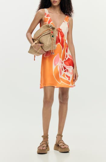 Scaled-up abstract florals bring bold movement to this breezy stretch-satin minidress. Designed with a deep V-neckline detailed with a keyhole and slender ties, the sleeveless silhouette drapes smoothly for a fluid, easy shape with a soft sheen and modern finish.