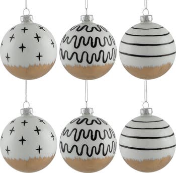 Dive into the enchanting world of holiday elegance with our set of glass ball Christmas ornaments. Crafted with attention to detail, each ornament boasts a timeless blend of classic sophistication and modern flair. Adorn your tree with the captivating, abstract designs, including sleek stripes, and mesmerizing wavy lines. Elevate your holiday decor with these stunning ornaments, adding a touch of refinement and charm to your seasonal celebrations. Product Features: 6-piece set Color: White, brass and black Balls are equipped with silver ornament caps Come ready-to-hang on silver cords Dimensions: 3" (80mm) Material(s): glass/metal Note:Set includes 2 of each item shown; total of 6 ornaments