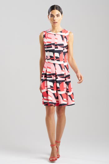 Twirl in abstract lines with this sleeveless pleated dress—where art meets movement.