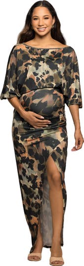 Turn heads in this stunning green abstract print maternity maxi dress featuring a modern batwing sleeve design and a flattering ruched waist. The relaxed top balances beautifully with the fitted skirt, while the front slit adds a touch of drama and movement. Perfect for evening occasions, special events, or when you want a bold yet elegant look, this dress combines comfort and sophistication in one effortless style. Made from a soft polyester blend for all day wearability.