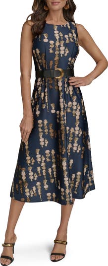 A captivating print dapples a desk-to-dinner dress cinched with a belt and cut to a beloved and versatile midi length.