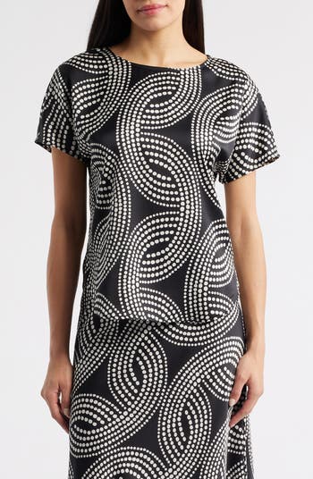 Abstract dots create bold visual rhythm across this sleek boat-neck blouse with desk-to-dinner appeal.