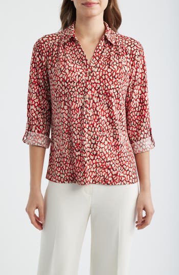 A lively print defines a casual button-up designed with roll-tab sleeves to give you two-looks-in-one.