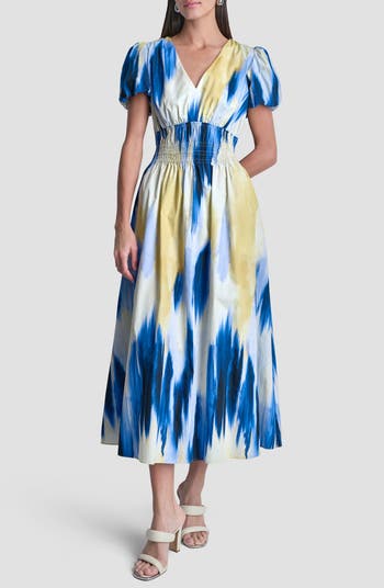 Vibrant color defines a vacation-ready dress shaped with a smocked waist and cut from cool cotton.