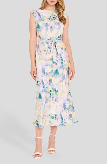 A painterly abstract print tells a luscious style story on a sleeveless dress that's cinched at the waist by a matching belt and ready for your next sunny-day event.