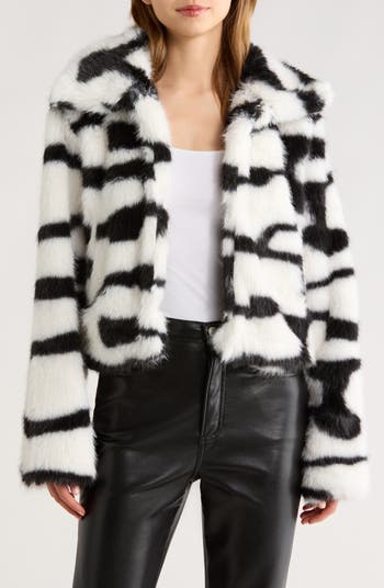 Build out your black-and-white collection with a fun-to-wear faux fur coat swirled in a groovy pattern.