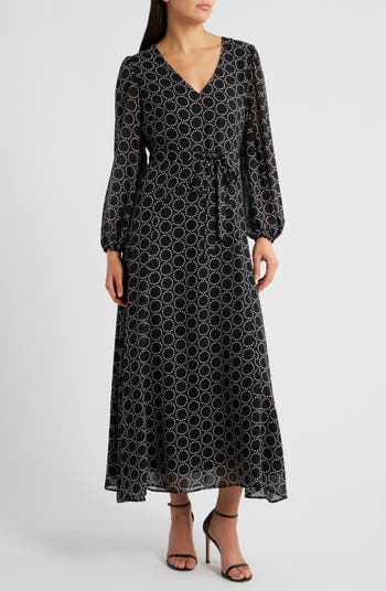 Build out your black-and-white collection with a charming dress served with gently gathered sleeves and cinched with an attached sash.