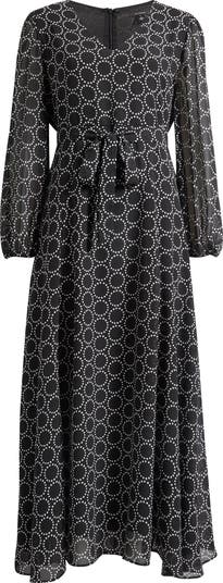 Build out your black-and-white collection with a charming dress served with gently gathered sleeves and cinched with an attached sash.