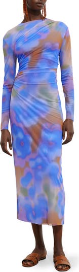 Embrace retro-chic style in this long-sleeve mesh dress featuring a colorful abstract pattern.