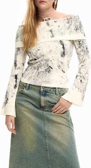 A dramatic folded neckline shows off your shoulders in this fine-gauge sweater rendered in a blurry abstract print and framed by flared sleeves.