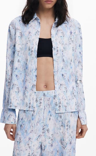 A blue-sky abstract print covers a button-up shirt created in a plissé fabrication that lends intriguing texture.