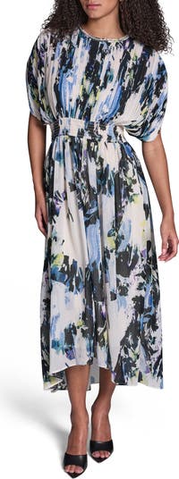Painterly abstract motifs sweep across this plissé chiffon midi dress designed with a smocked waist and airy skirt for soft, fluid movement.