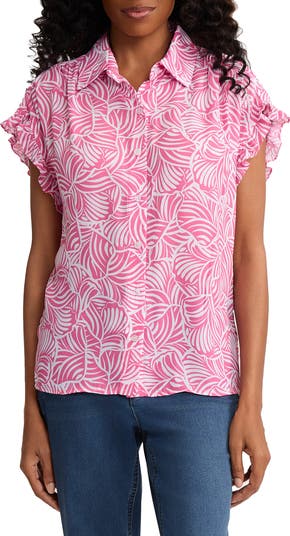 Ruffle-trimmed sleeves provide an enchanting finish for this button-front shirt in an eye-catching abstract print.