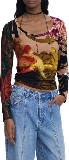 A surreal print invites conversation in this trim and stretchy long-sleeve T-shirt.