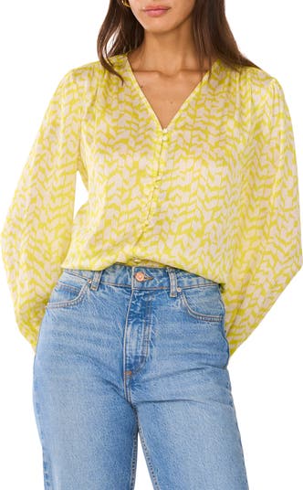 A collarless button-up gains style points with a light and lively print and dainty covered buttons.