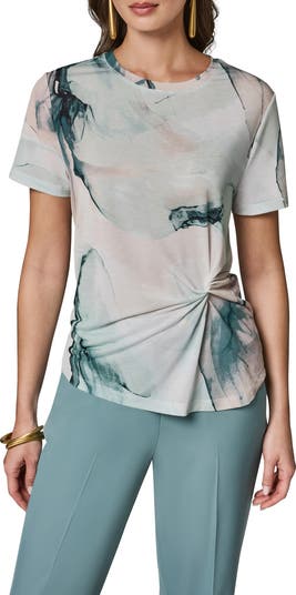 A dreamy print tells a captivating style story for a knit top shaped with a twist to cinch one side.