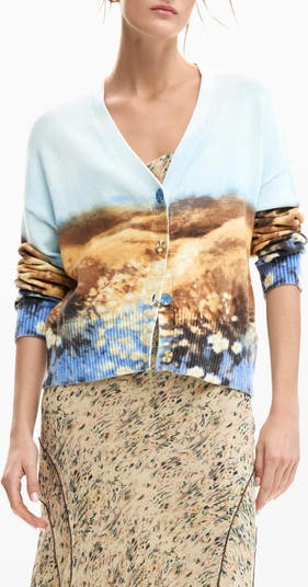 Add an artful touch with a stretch-cotton cardi knit in a fine gauge and covered in an impressionistic landscape.