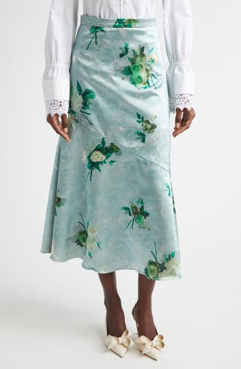 Be a walking work of art in this bias-cut midi skirt with abstract flora set against a canvas of lustrous crushed satin, evoking the dreamlike quality of painter Kaye Donachie's expressionist brushstrokes in wearable form. After commissioning a portrait of his late mother, Erdem Moralıoğlu partnered with Donachie for fall '25, translating the painter's palette into ethereal prints and rich textures.