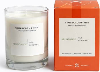 "Introducing the Conscious Ink Manifestation Candle. We invite you to make an intention. Then, every time you light your candle, repeat your intention, as you take a few deep breaths. You’ll be linking your intention with the candle aroma. So as you take in the scent, you’ll also be connecting to your intention, supporting it to manifest into your life. These candles are 10.5 ounces net weight with a long burn of up to 80 hours (candle vessel/13.5 oz.) For reference, the average size regular candle is 6.5 - 8 ounces with about a 50 -60 hr burn. Aroma Oud + Bergamot. An alluring blend of precious oud from Southern Asia with crisp bergamot and an orange granite accord. Each Abundance Manifestation Candle comes with a matching ""Abundance"" 3-Pack included ($10 value) to further support your intention. Linking Intention & Aroma: Our sense of smell is closely linked with our memory. Scents have a direct route to the limbic system, including the amygdala and the hippocampus, the areas of the brain related to emotion and memory. This means connecting a scent to an intention and emotion is a powerful practice for manifestation.