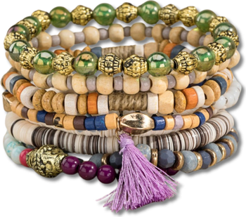 More than a look—an energy. The Abundance Stacking Bracelet Set is a layered expression of richness in color, texture, and spirit. Nine stretch strands come together in deep shades of mauve, green, and burgundy—woven with natural wood, luminous glass beads, seed beads, and warm gold-toned accents. A soft tassel detail adds movement and a touch of playful elegance.