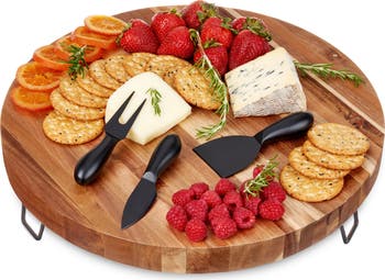 Arrange a mouthwatering display of cheese, charcuterie, fruit, and olives on this elegant acacia wood cheese board. Metal feet elevate the board from the table, making it a perfect centerpiece, while stainless steel cheese tools with a sleek black finish give this cheese and charcuterie board set a modern look.