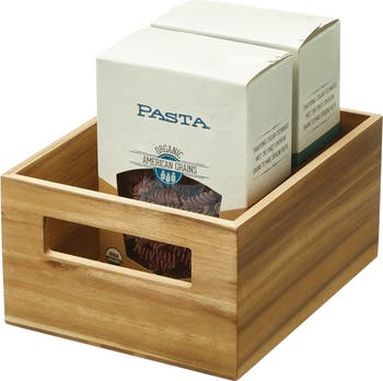 Our iDesign Acacia Wood Pantry Bin marries function and beauty, creating instant order throughout the kitchen. Made from natural acacia wood, this bin neatly stows away everything from packaged foods in the pantry to fresh produce on countertops for a fresh look to kitchen organizing. Finished with comfortable carry handles, this sophisticated catchall transports easily from cabinets to countertops or anywhere throughout the kitchen. With iDesign, you can live simply every day.