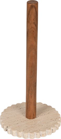 - A stylish paper towel holder featuring a natural acacia wood rod and a scalloped travertine base
