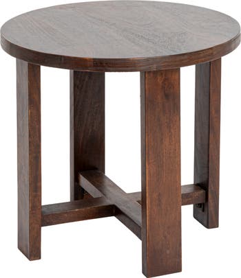 - An inviting beacon of warmth, this round trestle end table is bathed in a walnut hue, highlighting the rich texture of acacia wood