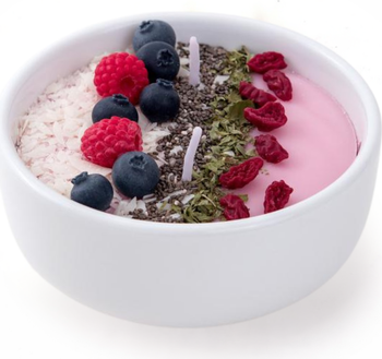 An acai bowl candle designed to look like a realistic food candle, featuring a smoothie-style base topped with sculpted berries, coconut flakes, chia seeds and dried parsley, details in a bowl-style vessel. Handcrafted and painted for lifelike texture, this novelty candle captures the look of a fresh breakfast bowl while adding a light, modern touch to kitchen décor, shelves or tables—and makes a charming gift for any occasion.