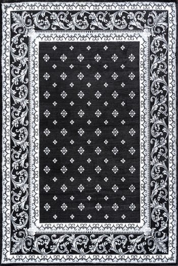 This elegant rug's medallions and acanthus leaf border are inspired by traditional French rug patterns. Our version in deep charcoal and ivory is the perfect way to update a living room, bedroom, entry, office or dining room. This versatile and elegant rug works beautifully in both traditional and modern spaces.