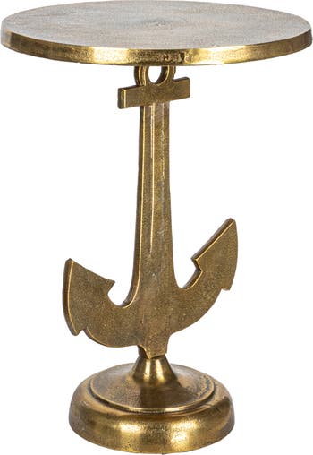 - Distinctive round accent table with nautical flair featuring a captivating anchor-shaped base.