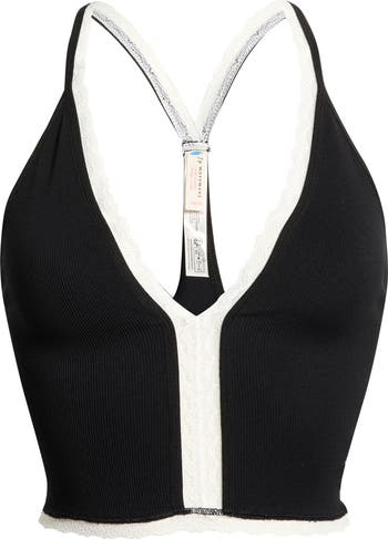 Lacy contrasting trim framed this fitted camisole made from a lightly compressive ribbed knit and topped with a flirty dipped neckline.