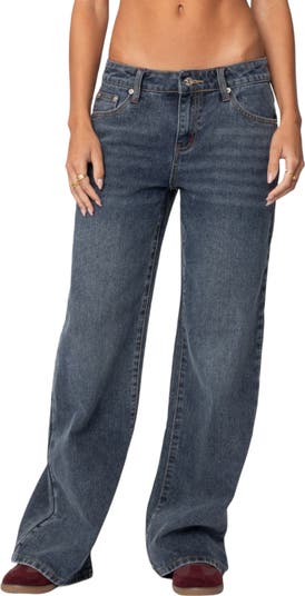 Relaxed and baggy wide legs give laid-back shape to these dark-blue jeans cut with a trendy low rise from nonstretch denim for an authentic feel.
