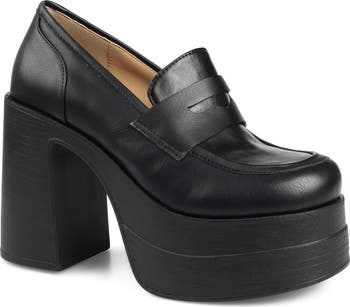A wood-grain platform amplifies the retro attitude of this loafer-inspired pump that's sure to make a statement.