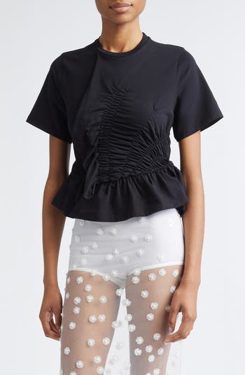 The Danish designer's flair for frills comes through in this cotton-rich jersey T-shirt steeped in romantic signatures—think smocked sections and a cascading ruffle that gives way to a flounced peplum.