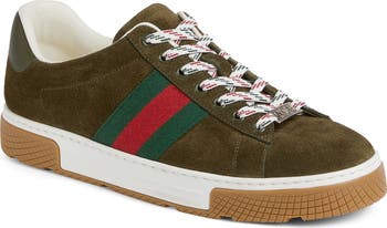 Signature striped webbing and a metal 'Ace' tag add an iconic finish to this low-top suede sneaker grounded by a chunky, bicolor bumper cupsole.